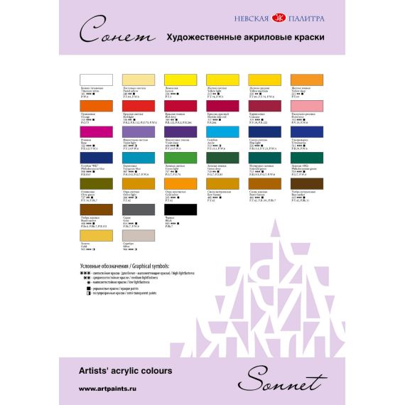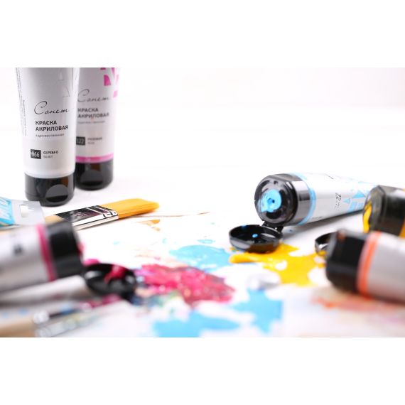 Художественные акриловые краски серии «Сонет» предназначены для живописи и декоративных работ. Они отличаются яркостью и чистотой цвета, легко наносятся на бумагу, картон, грунтованный холст, дерево, металл, кожу, ткань, легко смешиваются с водой. При высыхании образуют эластичную, матовую, несмываемую пленку.