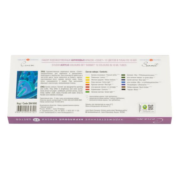 Акрил «Сонет» отличается яркостью и чистотой цвета. Краски этой серии универсальны в применении, они подойдут для художественных, декоративных, дизайнерских и других видов работ. За счет своей структуры краска хорошо ложится на различные поверхности: бумагу, кожу, картон, холст, дерево, металл. Все цвета смешиваются между собой. При высыхании образуется эластичная несмываемая пленка.