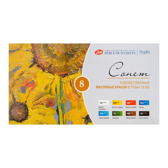 Масляные художественные краски серии «Сонет» разработаны по традиционным технологиям с использованием современных материалов и предназначены для живописи. Краски отличаются яркостью и чистотой цвета, пастозностью и высокой светостойкостью. Палитра масляных художественных красок включает в себя наиболее популярные цвета, необходимые для начинающих художников.