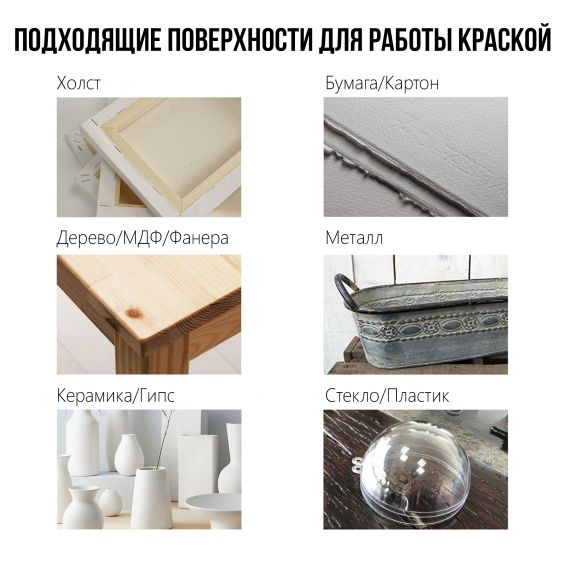 Подходящие поверхности: дерево, фанера, бумага, картон, ДВП, ДСП, грунтованный холст, стекло, пластмассы, грунтованный металл, бетон, кирпич, гипс, природный камень, штукатурка и др.