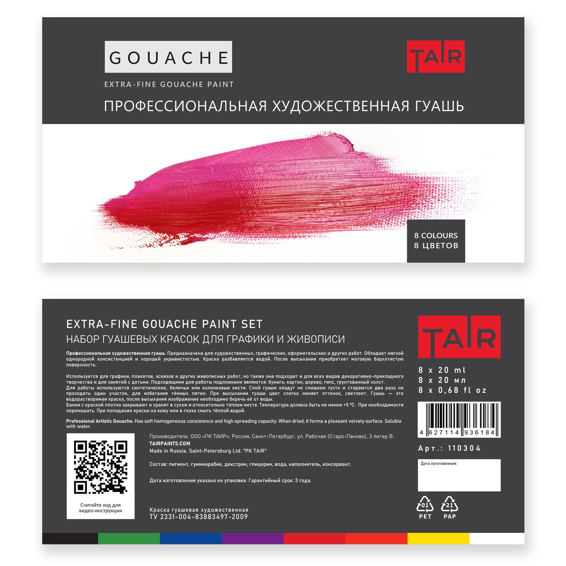 Гуашевые краски «ТАИР» изготавливаются из пигментов и клея с добавлением белил, что придаёт красочному слою гуаши характерную матовую бархатистую поверхность.