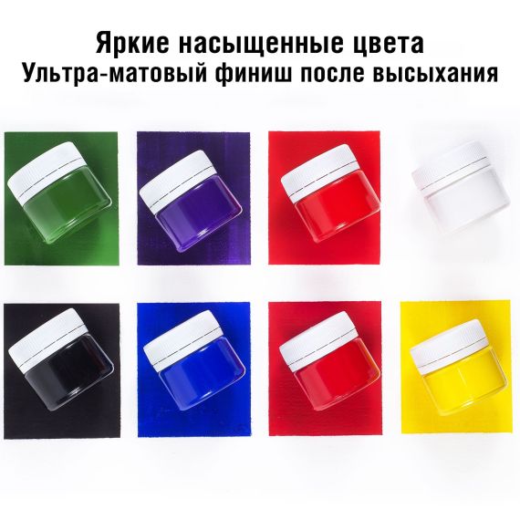 Палитра цветов в наборе (8 цветов по 20 мл): белила титановые, жёлтая светлая, красная средняя, маджента, ультрамарин, окись хрома, фиолетовая, сажа газовая.
