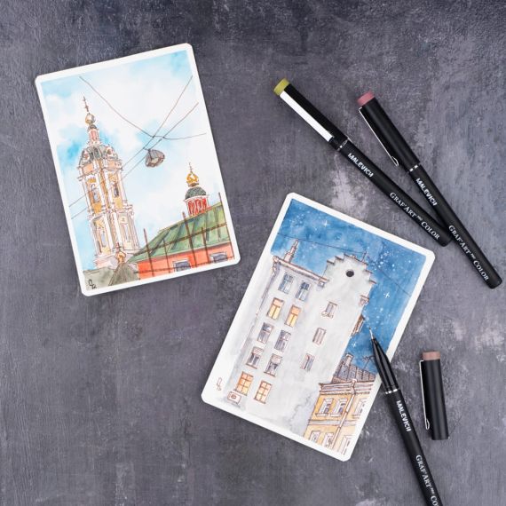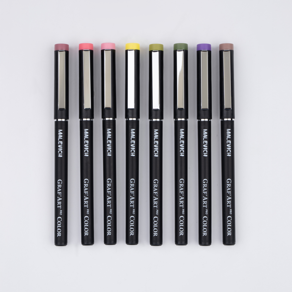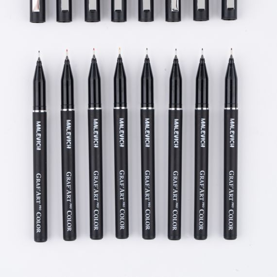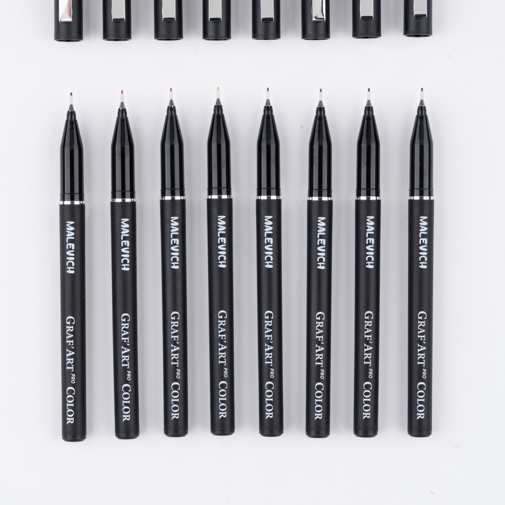 Капиллярные ручки Малевичъ Graf'Art PRO — это профессиональный инструмент для письма, черчения и рисования. В ручках используются специальные водостойкие архивные чернила с высокой степенью светостойкости и глубоким черным цветом. Рисунок после высыхания не размывается водой, за счёт этого линеры можно использовать в смешанной технике с акварелью, акрилом или гуашью. Ручки произведены в корпусе нового улучшенного дизайна — удлинённый пишущий узел и эргономичная гладкая секция захвата, которую значительно удобнее держать в руке.
