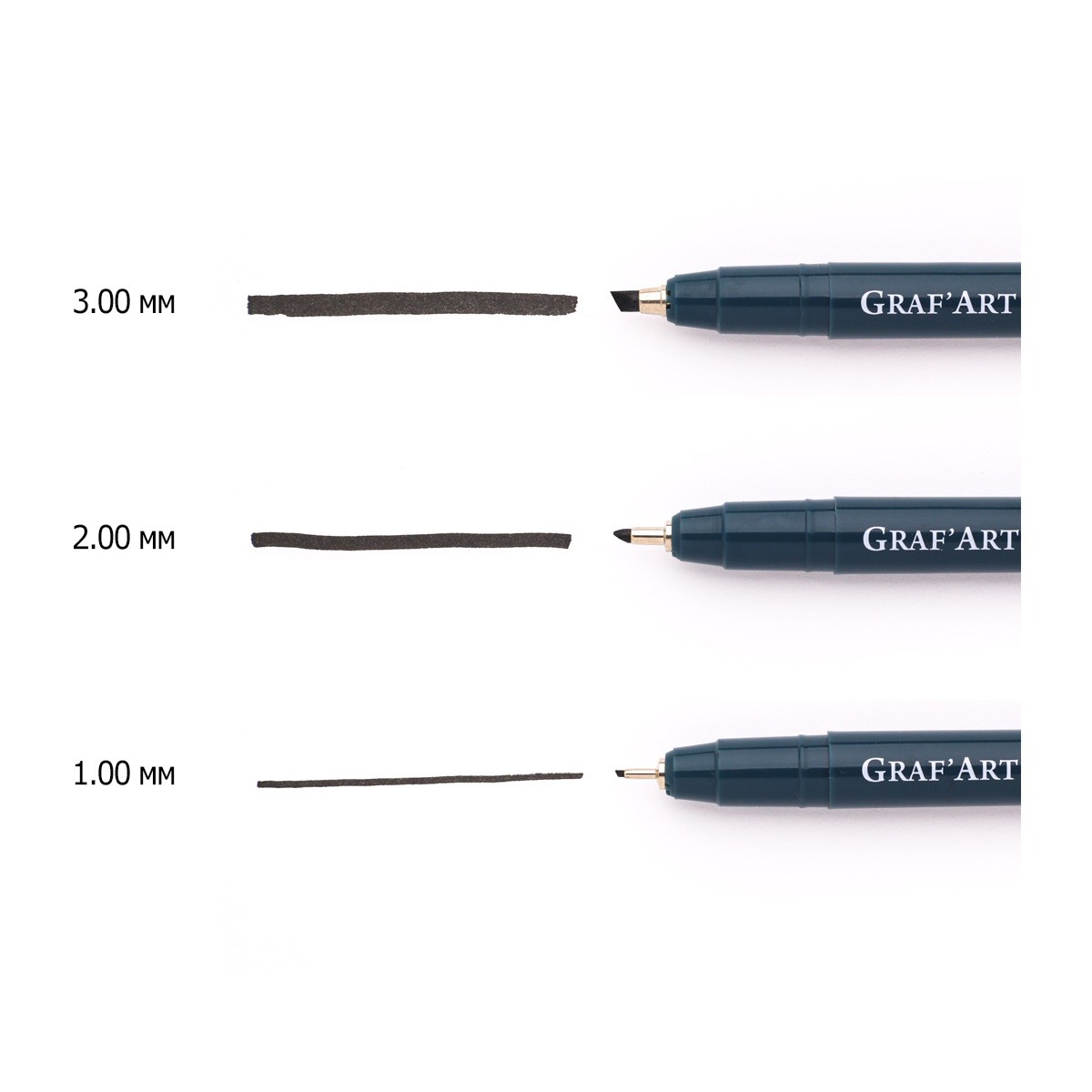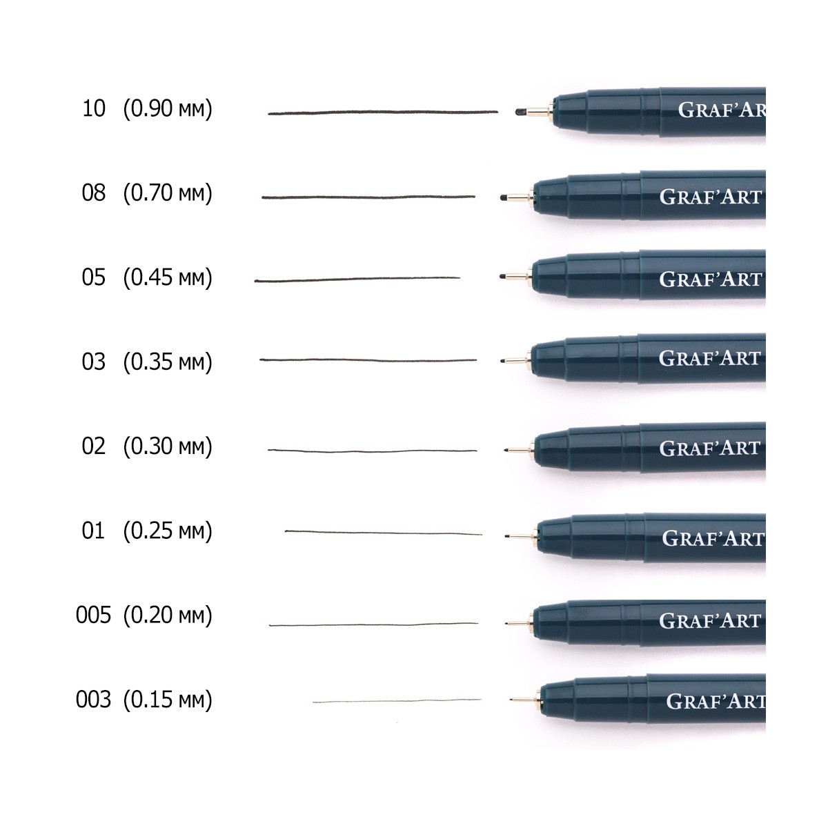 Капиллярные ручки Малевичъ "Graf'Art" — это универсальный инструмент для письма, рисования и черчения. Высококачественные чернила отлично пишут на бумаге любого типа, чернила не растекаются и не протекают на обратную сторону листа. После высыхания чернила обладают высокой степенью светостойкости, работы выполненные такими чернилами не выцветают со временем. Чернила водостойкие, что обеспечивает возможность их использования с красками и маркерами на водной основе. В серии представлены ручки с раной толщиной пишущего узла 0,15 до 0,9 мм., а так же ручки со скошенным наконечником и наконечником-кистью.
