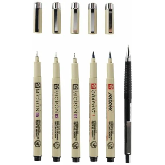 В наборе 6 предметов: 3 чёрных капиллярных ручки Sakura Pigma Micron с тонкими наконечниками (0,25 мм, 0,35 мм, 0.45 мм), 1 черная ручка с наконечником-кистью Pigma Brush, которая дает еще больше возможностей для творчества (брашпен, ручка кисть, brush pen), 1 черная ручка Pigma PN (0.4-0.5 мм), 1 механический карандаш 0.7 мм. Это позволяет выбрать нужный размер для создания различных эффектов и деталей в работах.