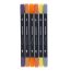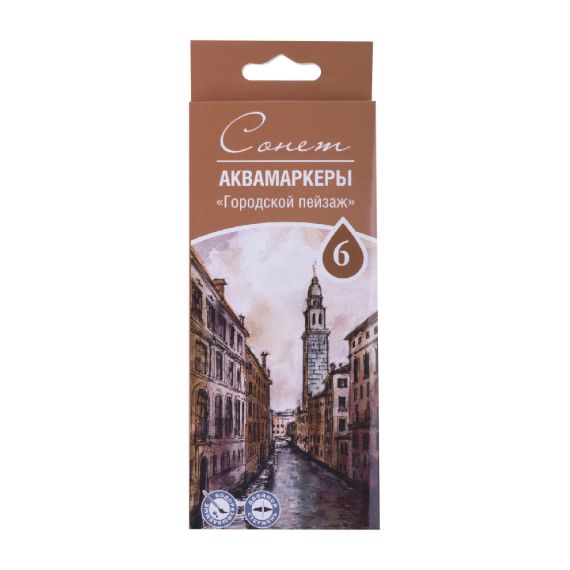 Набор водорастворимых светостойких аквамаркеров «Сонет» серии «Городской пейзаж» предназначен для живописи, рисования, работы в смешанных техниках и создан специально для любителей имитации старинной иллюстрации и зарисовок городских улиц в технике гризайль [тональная градация одного цвета]. Прекрасно совмещают в себе свойства маркеров и акварельных красок. Для достижения акварельного эффекта размывайте маркеры при помощи смоченной водой кисти на самой бумаге или на палитре. Аквамаркеры имеют яркие и насыщенные цвета, которые превосходно смешиваются между собой. Гибкий наконечник в форме кисточки предназначен для мягкого закрашивания, тонкий стержень – для прорисовки деталей. Для работы лучше всего использовать акварельную бумагу. Цвета коричневых и серых оттенков можно использовать самостоятельно, создавая живописные акварельные композиции, или дополнить к цветам основного набора аквамаркеров «Сонет» 6 цветов.