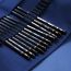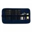 В составе набора 27 предметов: 3 угольных карандаша (Soft, Medium, Hard); 16 чернографитных карандашей: 2H -1шт, H – 2шт, HB – 2шт, B – 1шт, 2B – 3шт, 4B – 3шт, 6B – 2шт, 8B – 2шт; удлинитель для карандашей; 3 растушевки (small, medium, large); нож для заточки карандашей; ластик-клячка; каучуковый ластик для графических материалов; тканевый пенал-свиток.