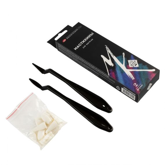 В наборе 2 пластиковых мастихина разной формы (овал и треугольник) и 20 сменных насадок. Такие мастихины применяются для растушёвки пастели и других сухих графических материалов — уголь, сангина, сепия, графит, цветные карандаши и прочее. Большое количество сменных насадок позволяет одновременно работать с несколькими цветами не создавая грязи, после использования насадки можно промыть в тёплой мыльной воде.