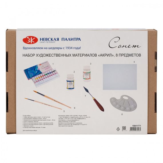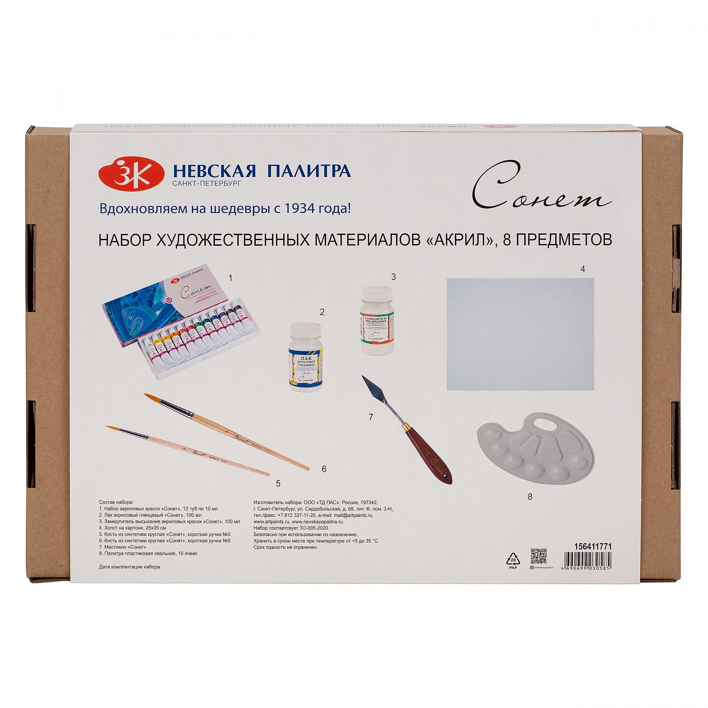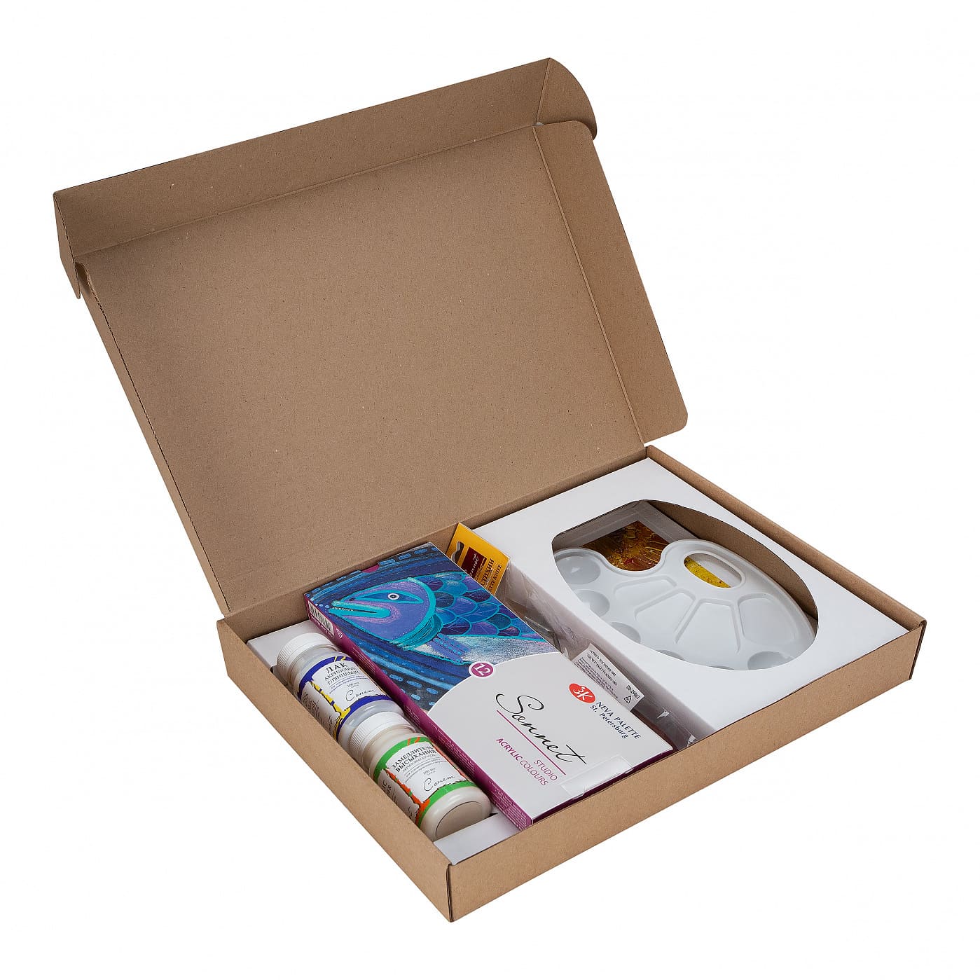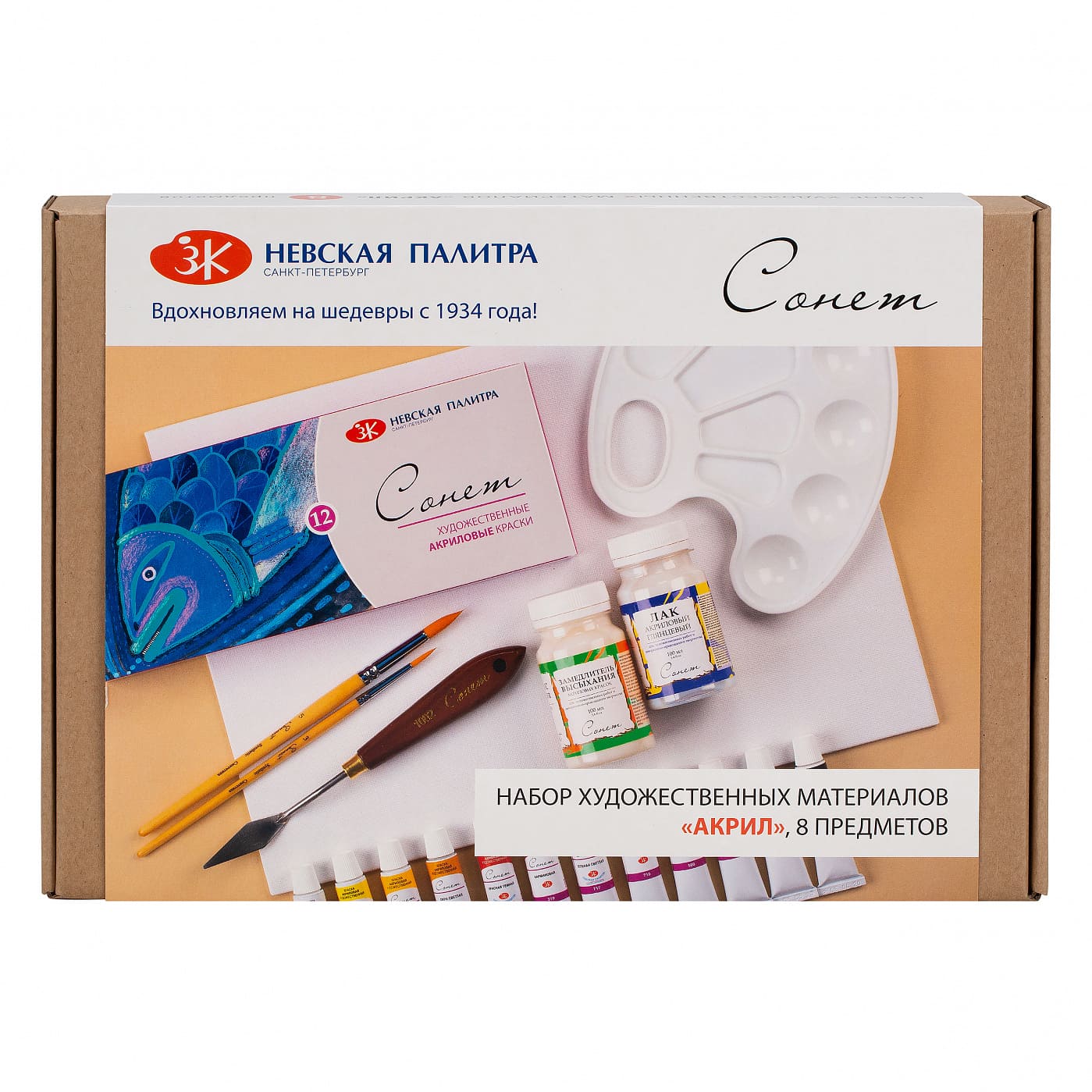 Набор художественных материалов "Сонет" Акрил включает в себя всё самое необходимое для знакомства с живописью акрилом. Это стартовый набор, который позволяет освоить новые техники рисования и попробовать новые материалы. Комплект материалов включает набор акрила "Сонет" 12 цветов в тубах по 10 мл., лак акриловый глянцевый, замедлитель высыхания акриловых красок, кисти круглые синтетика №5 и №3, мастихин, пластиковую палитру для смешивания красок и холст на картоне 25х35 см.
