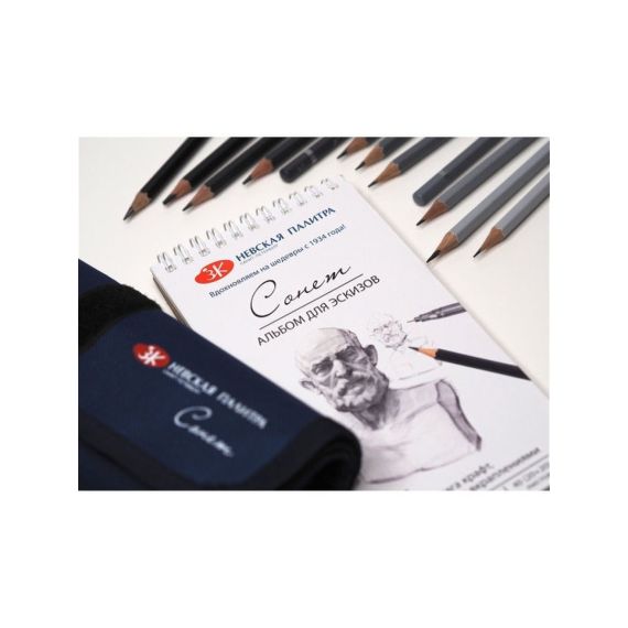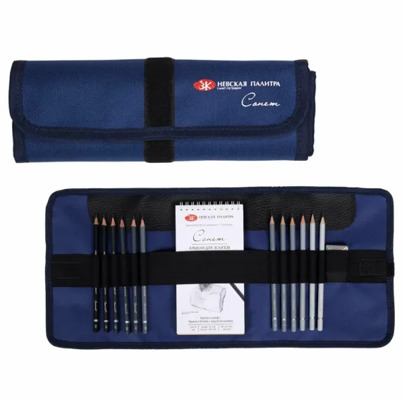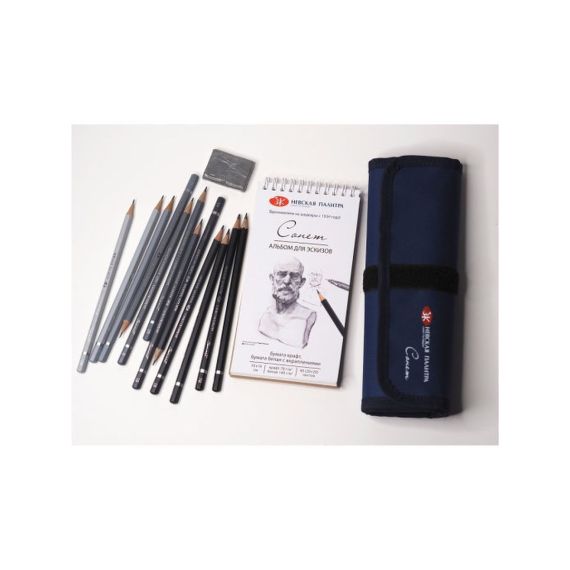 Набор художественных материалов "Сонет" предназначен для графических работ, набросков и эскизов. В наборе есть всё самое необходимое для графических зарисовок: альбом для эскизов "Сонет" с крафтовой и белой бумагой с вкраплениями, 12 карандашей "Санкт-Петербург" различной твердости, и ластик-клячка. Поставляется в удобном пенале-скрутке.