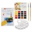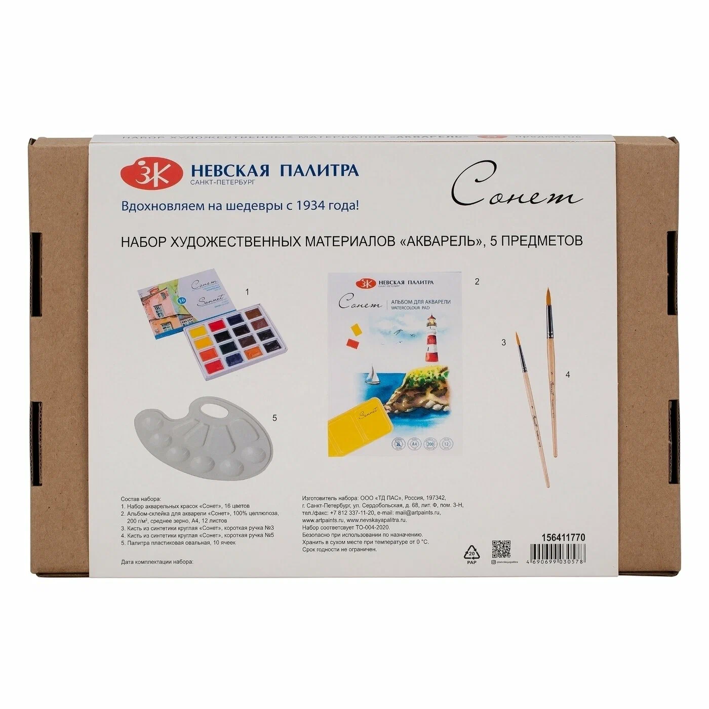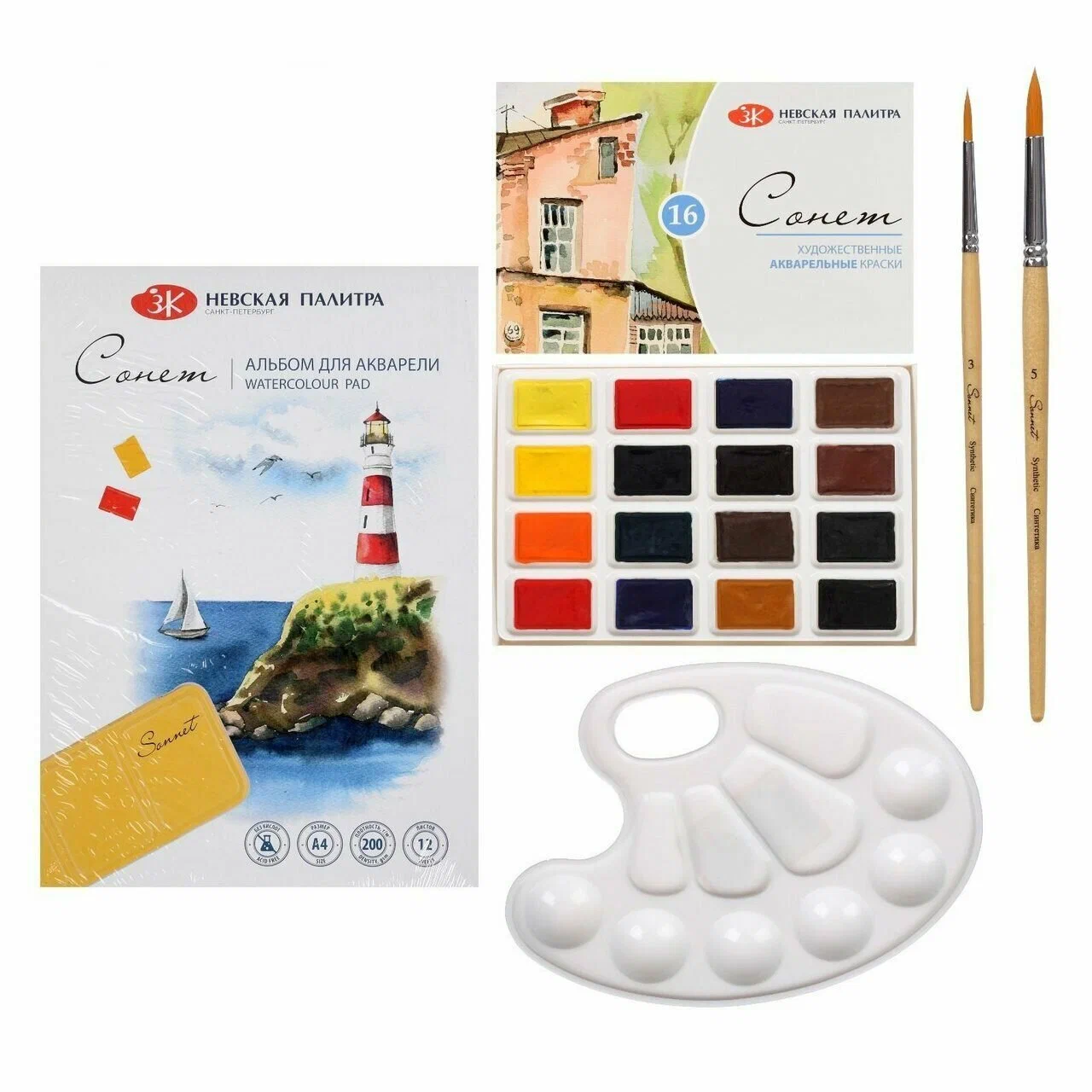 Набор художественных материалов "Сонет" Акварель включает в себя всё самое необходимое для знакомства с акварельной живопись — набор акварельных красок "Сонет" из 16 цветов, пластиковая палитра для смешивания красок, альбом для акварели "Сонет" и две кисти круглые из синтетики №3 и №5.