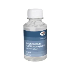 Разбавитель слабопахнущий предназначен для разведения и снижения вязкости художественных масляных, пентамасляных и алкидных красок, рельефных паст, смывания красок с полотен и палитры, мытья кистей.