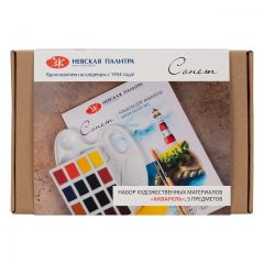 Набор художественных материалов " Сонет " Акварель включает в себя всё самое необходимое для знакомства с акварельной живопись — набор акварельных красок " Сонет " из 16 цветов, пластиковая палитра для смешивания красок, альбом для акварели " Сонет " и две кисти круглые из синтетики №3 и №5.
