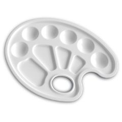 Палитры художника предназначены для смешивания красок и получения новых тонов при создании картины. Имеют различные формы, безупречно гладкую поверхность белого цвета. Легко отмываются после использования.