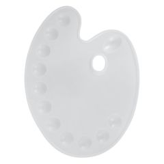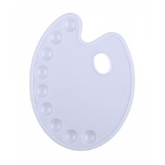 Палитра пластиковая с 11 ячейками, овальной формы, для смешивания краски во время работы. С отверстием для большого пальца руки. Используется для масляной живописи. Размер: 27х36 см.