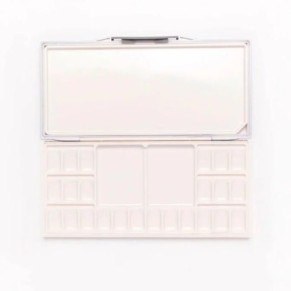 Профессиональная герметичная палитра для акварели. Палитра выполнена из высококачественного белоснежного пластика, благодаря чему легко моется и не искажает восприятие цвета при смешивании. Герметичная крышка обеспечивает удобную транспортировку и сохранность красок внутри палитры. В палитре предусмотрено 23 ячейки, 2 палетки для смешивания и съёмная полочка.