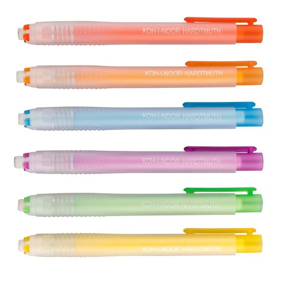 Ластик выдвигающийся в прочном пластиковом корпусе с клипом. Четырехлепестковый зажим резинки. Легко выдвигается при помощи нажимного механизма.