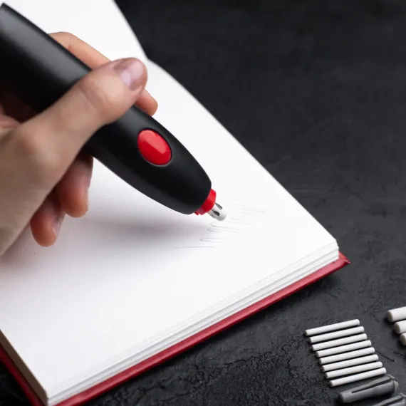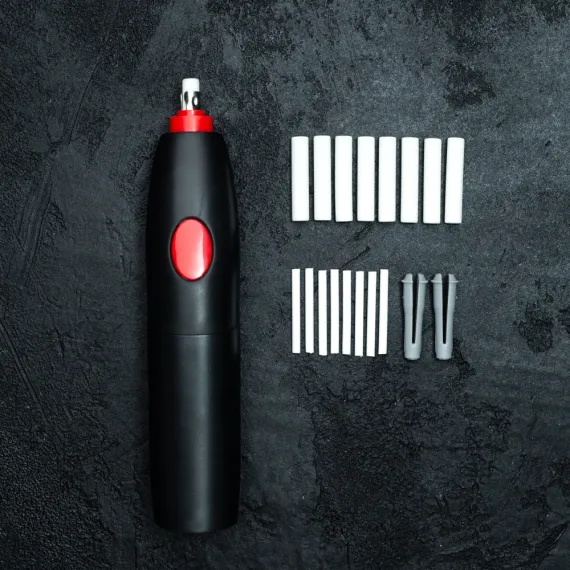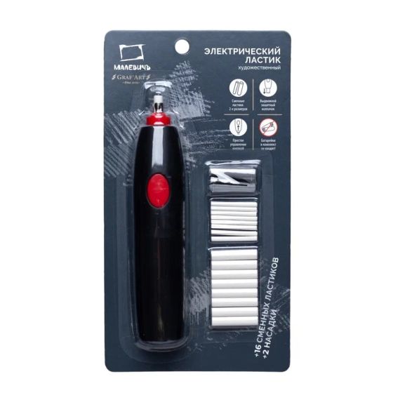 Электрический ластик от бренда «Малевичъ» — удобный инструмент для точечной корректировки работ, выполненных чернографитным карандашом. Эргономичная ручка с кнопкой на корпусе позволяет удобно пользоваться ластиком как левой так и правой рукой. Мягкий каучуковый картридж легко сменить на новый — в комплекте 16 ластиков и 2 насадки для ластиков разного диаметра. Быстрый мотор позволяет стирать, либо снимать слой карандаша ровно там, где вам нужно. Устройство оснащено защитным колпачком, который предотвращает загрязнение ластика. С помощью электрического ластика вы без каких-либо усилий можете подкорректировать чертеж, эскиз или скетч не причиняя вреда бумаге.