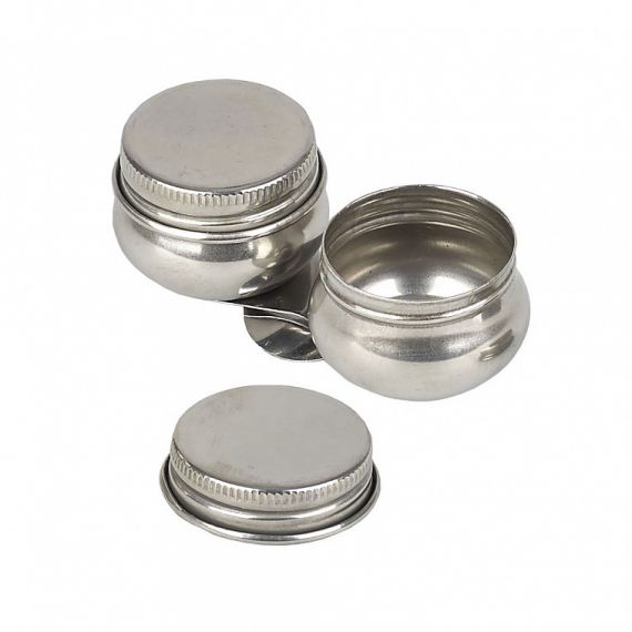 Двойная масленка имеет крепление на палитру и предназначена для хранения разбавителя для масляных красок. Покрыта антикоррозийным составом, который предохраняет ее от воздействия растворителя. Две емкости позволяют использовать несколько разбавителей, комбинации разбавителя, льняного масла или лака.
