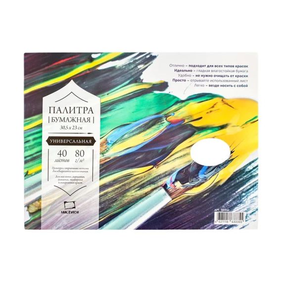 Одноразовая палитра Малевичъ представляет собой альбом из 40 отрывных листов плотной бумаги. Благодаря анатомически выверенным вырезам она удобно ложится в руку, делая процесс живописи легким и комфортным. Белый цвет бумаги позволяет оценить, как смешиваемый оттенок краски будет выглядеть на белом холсте или картоне. Бумажная палитра Малевичъ: •изготавливается из экологически чистых материалов •позволяет оценить, как краска будет выглядеть на холсте •дает возможность постоянно иметь под рукой свежую палитру •не требует чистки после использования •пригодна для вторичной переработки •размер палитры 23х30,5 см •плотность бумаги 80мг/м2