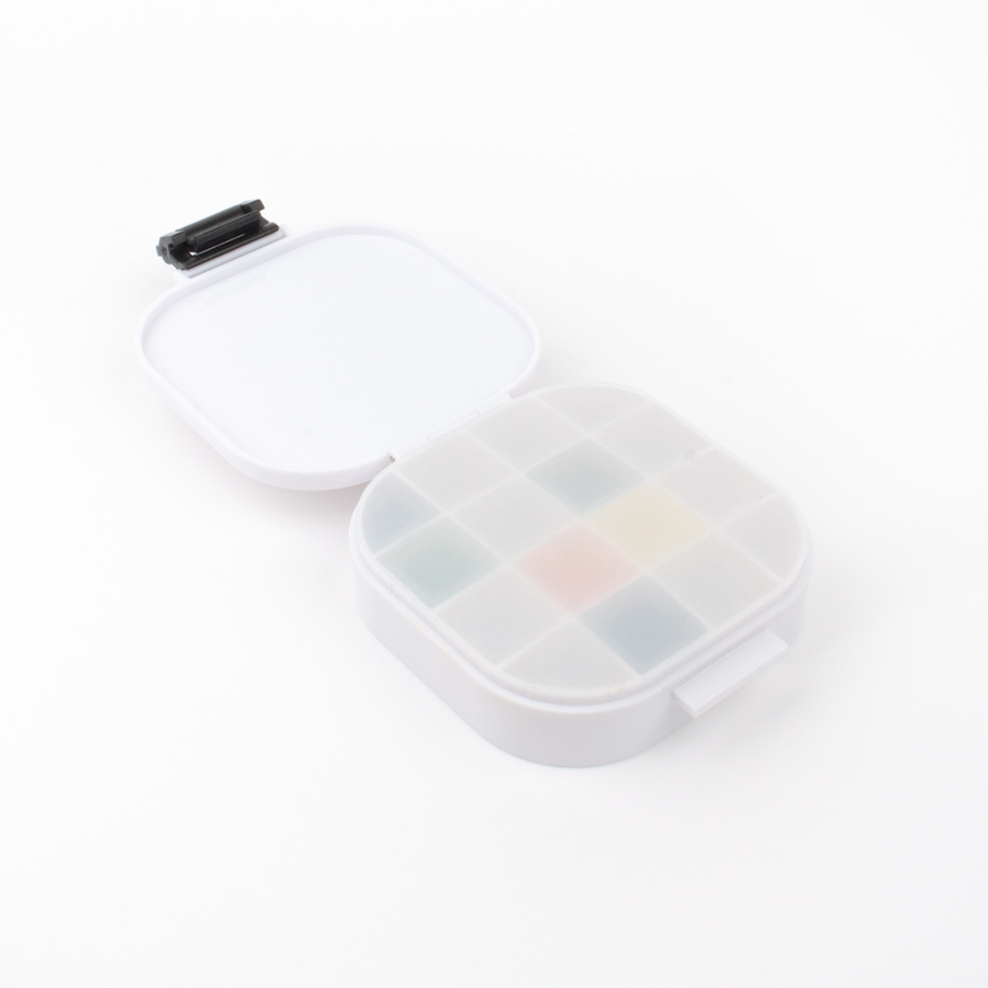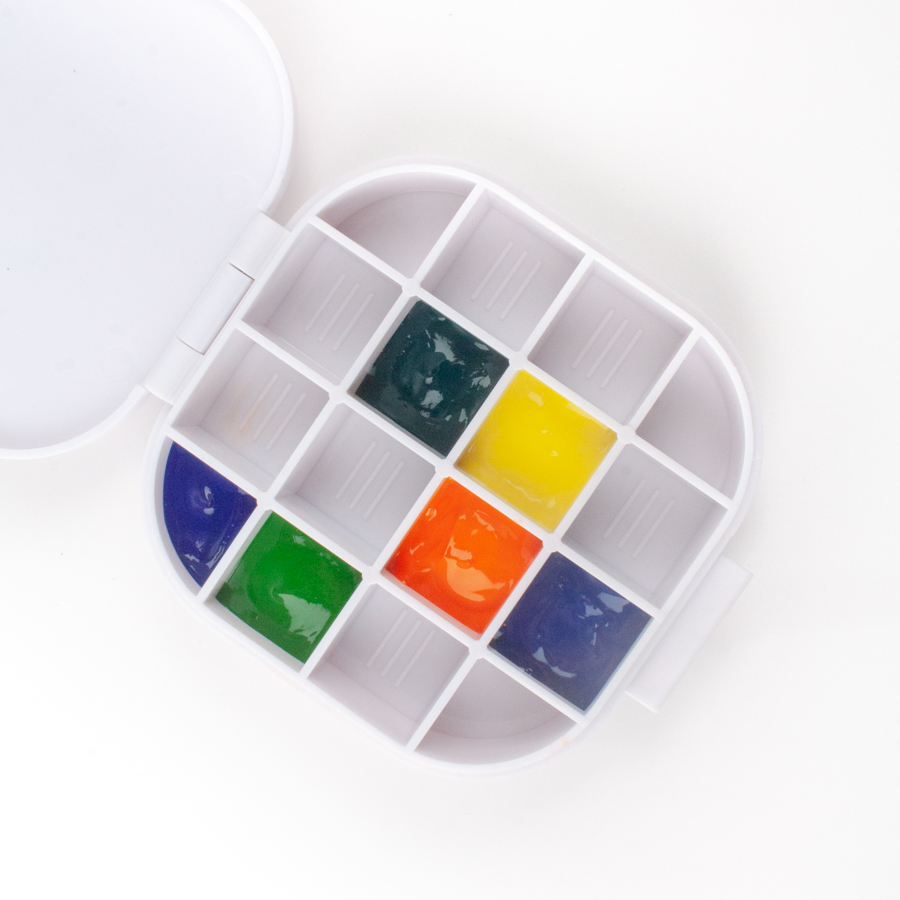 Не рекомендуется заполнять ячейки до краев. Краски будут надежно сохранены долгое время, но не забывайте, что краскам необходимо проветривание при таком хранении и периодически палитру надо открывать для притока свежего воздуха. Размер мини палитры Малевич 9х9х2,5 см, 16 ячеек каждая ячейка 1,9х1,9х1,5 см (за исключением угловых из-за нестандартной формы).