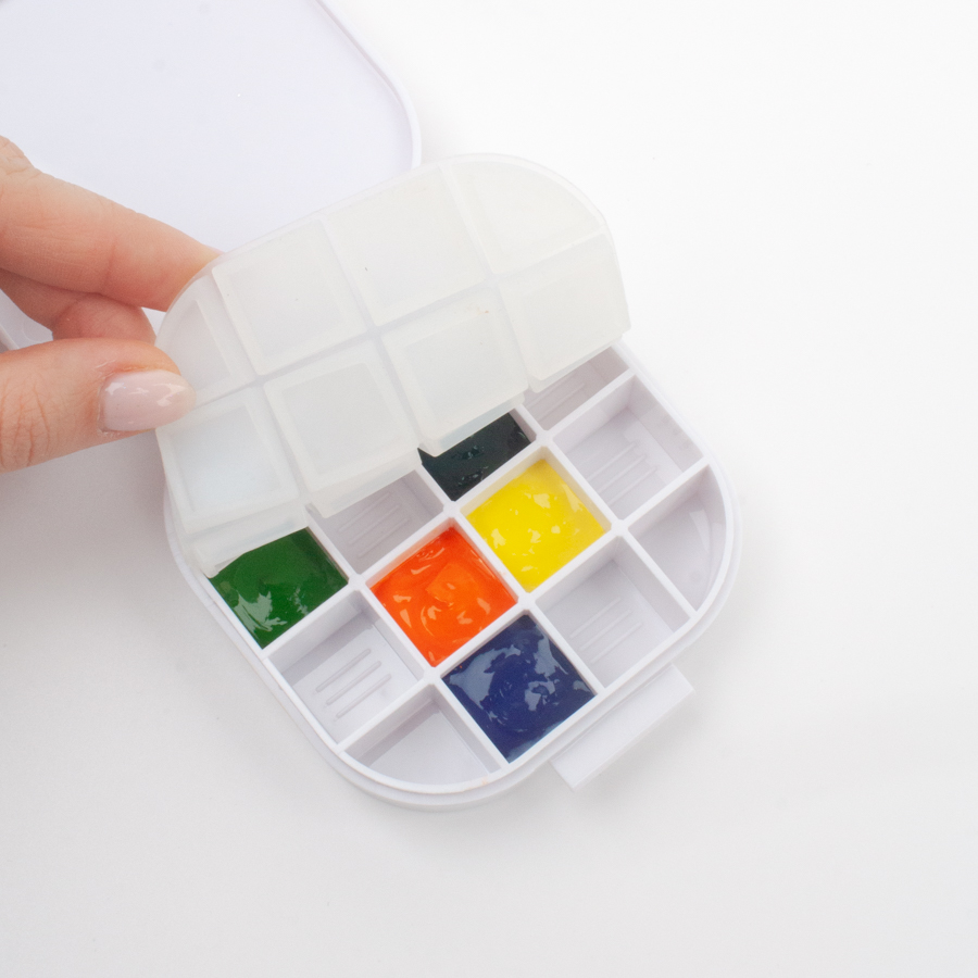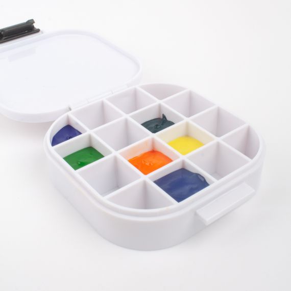 Палитра выполнена из пластика, под крышкой имеется силиконовая вставка, которая обеспечивает герметичность и не даст краскам перетекать из ячейки в ячейку, создавая грязь. Такая палитра будет удобна для акварели, гуаши, акрила, масла.