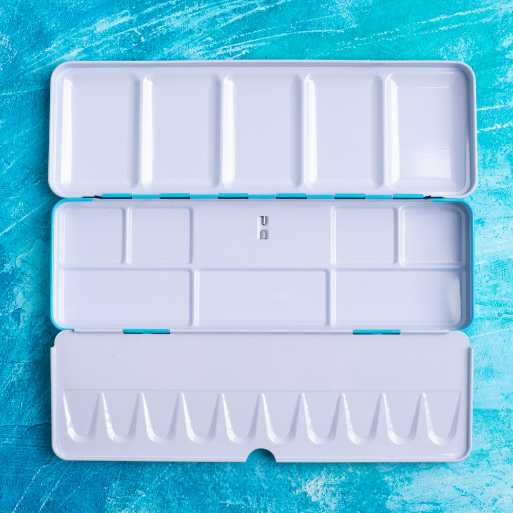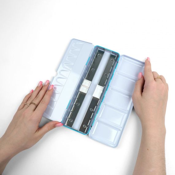 Металлические пеналы для акварели в кюветах приятного популярного цвета, так полюбившийся покупателям, теперь доступны отдельно. Пенал на 24 кюветы с металлической съемной вставкой для кювет вмещает 14 кювет по 2,5 мл в крайних отсеках (по длинной стороне) и 11 полукювет (1,5 мл) в центральном отсеке одновременно.