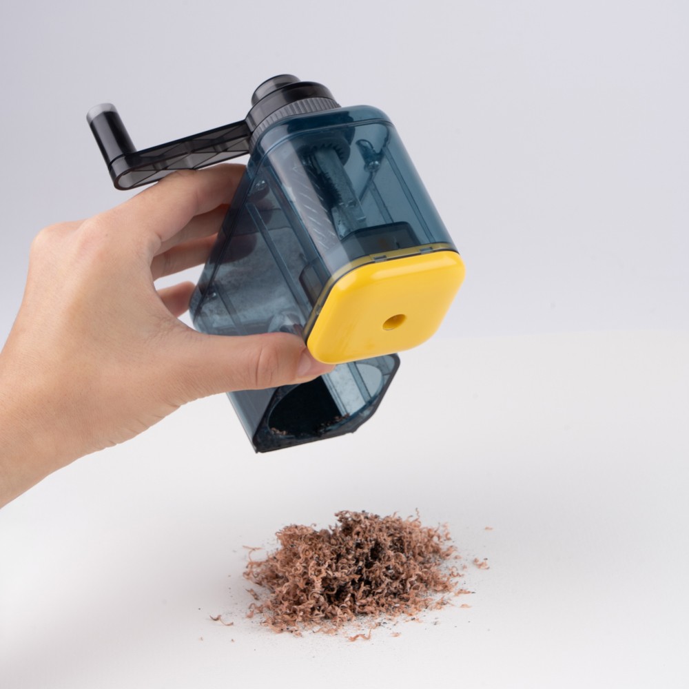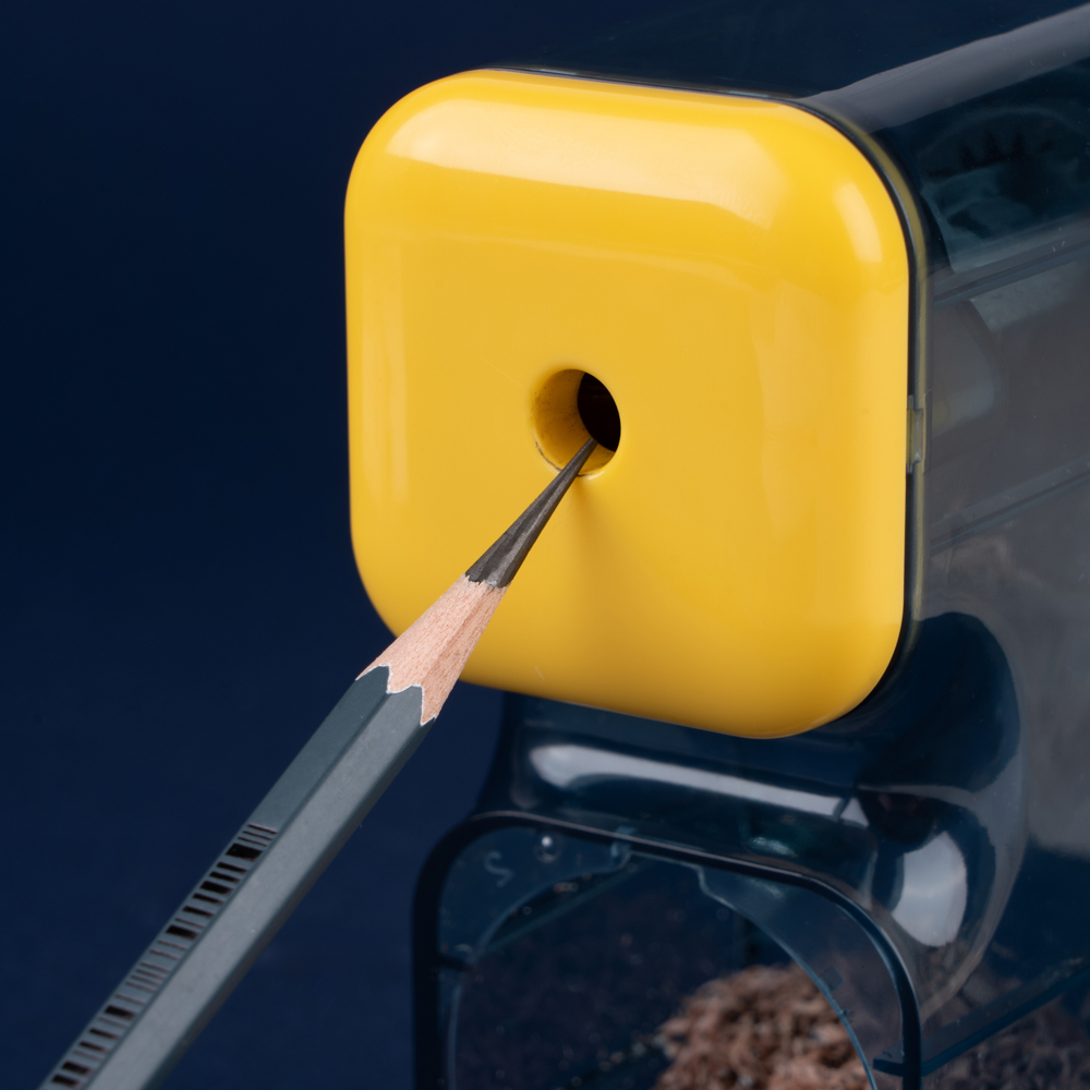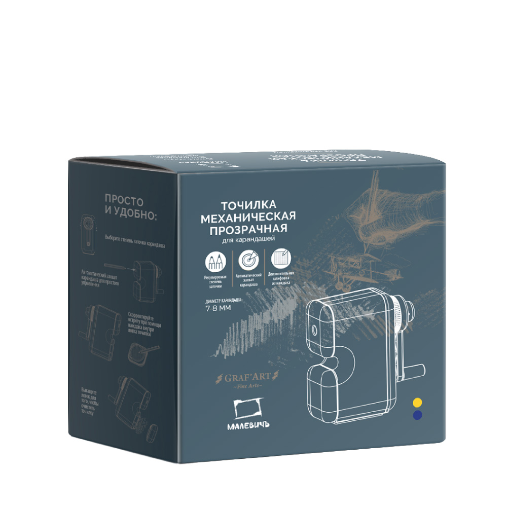 Механическая прозрачная точилка в эргономичном корпусе. Регулируемая степень заточки и автоматический захват карандаша для профессиональной заточки.. Подходит для карандашей 7-8 мм. диаметром. Внутри крышки контейнера расположена наждачная бумага для корректировки остроты грифеля.