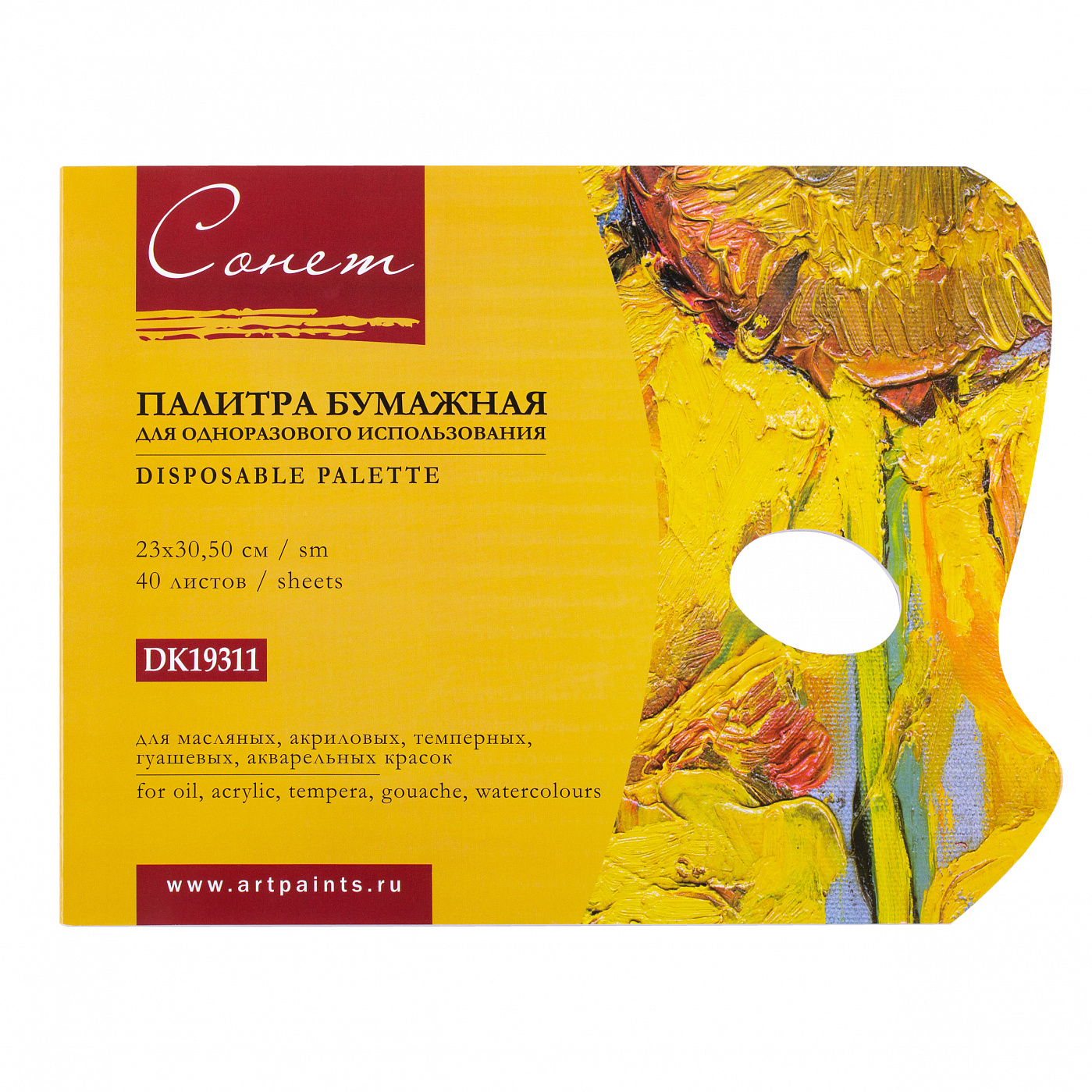 Бумажная палитра "Сонет" предназначена для смешивания красок любого типа — акриловые, масляные, акварельные, гуашь или темпера. Задник палитры выполнен из плотного картона, что обеспечивает удобство в работе на весу, в блоке предусмотрено отверстие для пальца. Плотные гладкие листы палитры собраны в склейку. В палитре 40 листов размером 23х30.5 см.