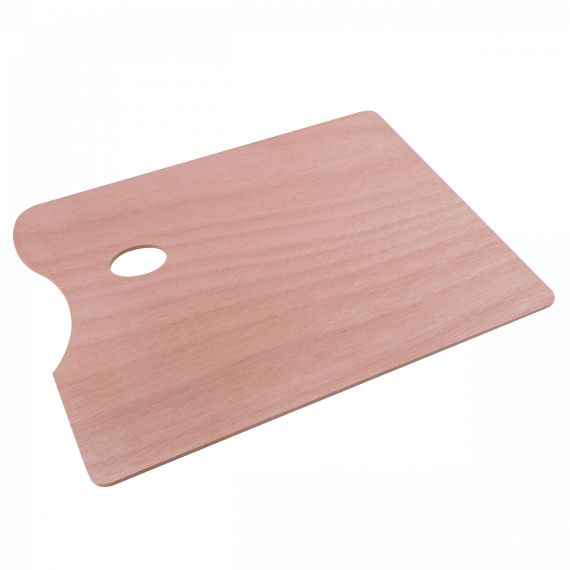 Деревянная палитра прямоугольной формы. Такую палитру удобно держать в мастерской художника на рабочем столе, чтобы нужные краски и любимые оттенки всегда были под рукой. При этом она довольно легкая, имеет отверстие для большого пальца, ее удобно держать в руках, работая стоя.