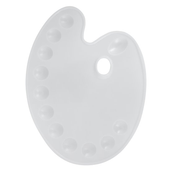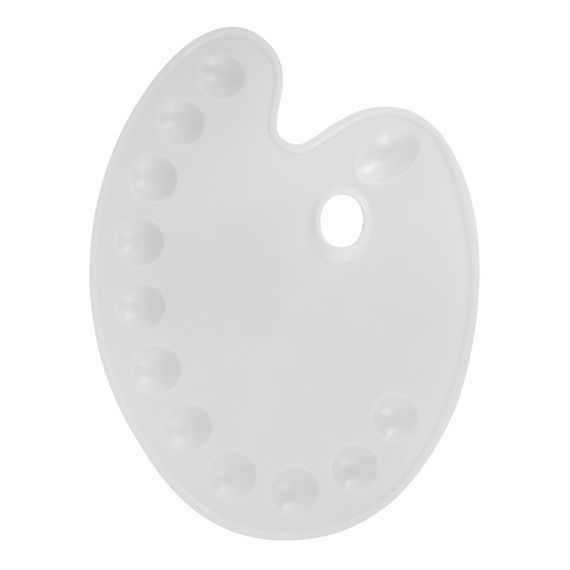 Палитра пластиковая с 11 ячейками, овальной формы, для смешивания краски во время работы. С отверстием для большого пальца руки. Используется для масляной живописи.