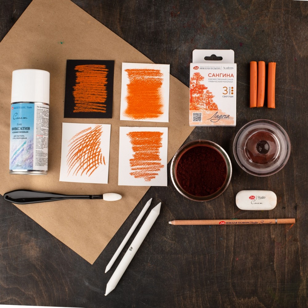 Сухой художественный материал сангина светлая предназначен для выполнения графических работ на бумаге, крафте, тонированной бумаге. Сангина наносится штриховкой и легко растушёвывается по поверхности бумаги. Для внесения исправлений в рисунок сангина удаляется с поверхности бумаги стирательной резинкой, формопластом или клячкой. Для долговечного хранения завершенные работы требуют дополнительного закрепления лаком фиксативом.
