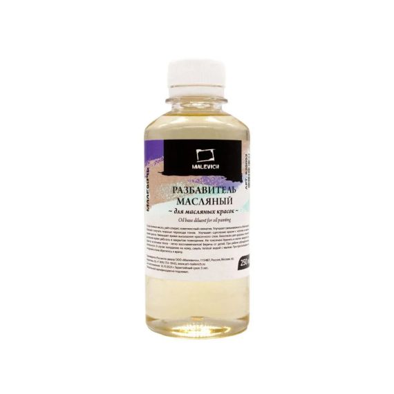 Разбавитель масляный «Малевичъ» делает краски менее насыщенными и более прозрачными, позволяя получать плавные переходы тонов. Также улучшает адгезию и разносимость красок, делая их более текучими. Разбавитель быстро высыхает, не желтеет.