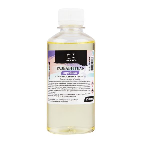 Разбавитель тройник предназначен для разведения художественных масляных красок. Имеет высокую прозрачность, не желтеет со временем. Ускоряет время высыхания красок, придает глянцевый блеск. Состав: скипидар живичный, смола араукарии, масло льняное.