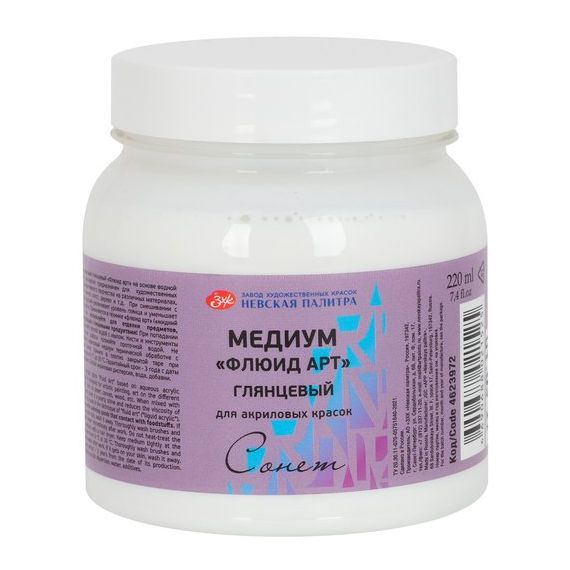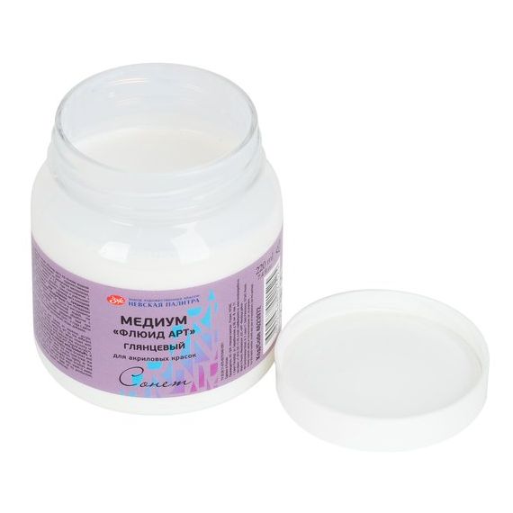 Медиум акриловый глянцевый «Флюид арт» на основе водной акриловой дисперсии предназначен для художественных работ и декоративного творчества на различных материалах, таких как бумага, холст, дерево и т.д. При смешивании с акриловой краской увеличивает уровень глянца и уменьшает вязкость краски. Применяется в технике «флюид арт» (жидкий акрил).