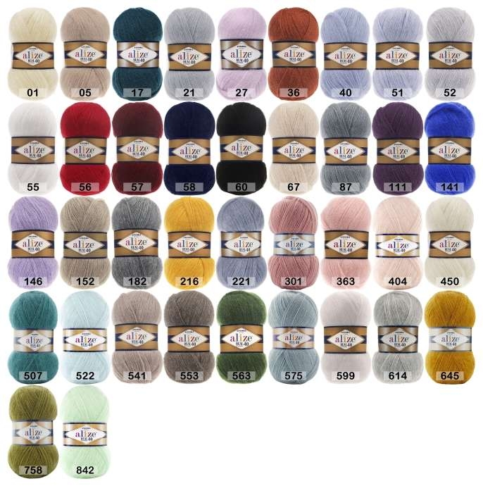 Если вы собираетесь связать, шаль, шарф, свитер, палантин, или другую вещь похожих типов, то купить пряжу Angora Real 40 будет отличным решением. Для такой одежды она подходит идеально. С ее помощью можно вязать изделия как для взрослых, так и для детей. Только не забудьте подготовить еще и инструменты — крючок 1-4 и спицы 2,5-5. Карта цветов Ализе Ангора Реал 40 содержит оттенки красного, розового, синего, зеленого и других цветов, а также множество пастельных тонов. Готовые изделия рекомендуется стирать в деликатном режиме при температуре воды 30 градусов, а гладить — при температуре до 120 градусов.