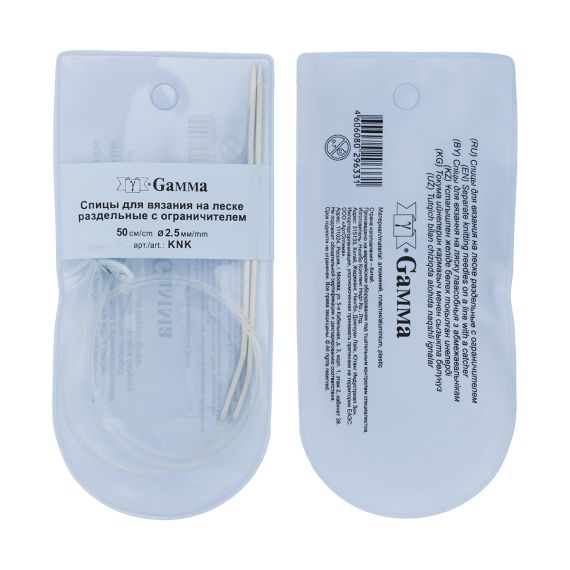 Спицы раздельные на леске "Gamma" KNK это специальный вид спиц для вязания, которые имеют две отдельные длинные спицы, соединенные гибким кабелем или леской. Они обеспечивают удобство при вязании круглых и трубчатых изделий, таких как носки, варежки или рукава свитеров.