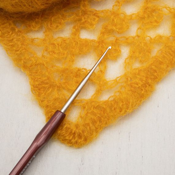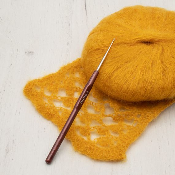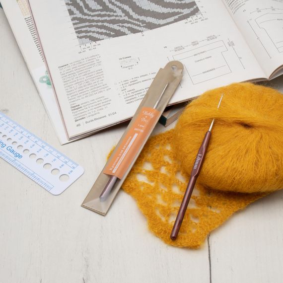 Крючок с пластиковой ручкой от Hobby&Pro – удобный инструмент для вязания нитками и тонкой пряжей. Стержень из нержавеющей стали прочный и очень гладкий, поэтому пряжа при вязании не деформируется, сохраняет структуру и ворс. Такой крючок отлично подходит для материалов, которые незначительно растягиваются и не скользят, например шерсти, акрила или хлопка без мерсеризации.